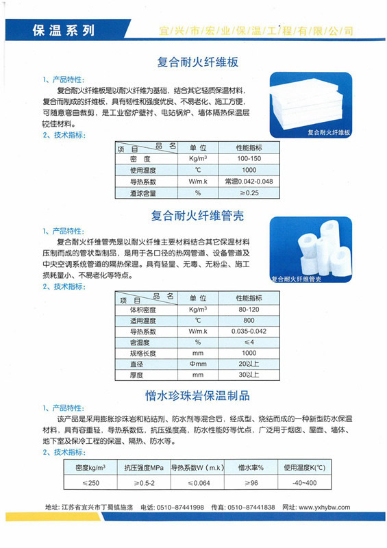 復(fù)合耐火纖維板、復(fù)合耐火纖維管殼、憎水珍珠巖保溫制品